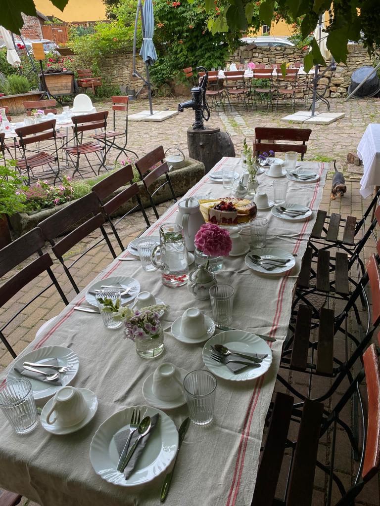 Werfen Sie einen Blick in unseren mit Herzblut gestalteten Zwei-Seiten-Hof und unser Kaffee mit vielen Köstlichkeiten